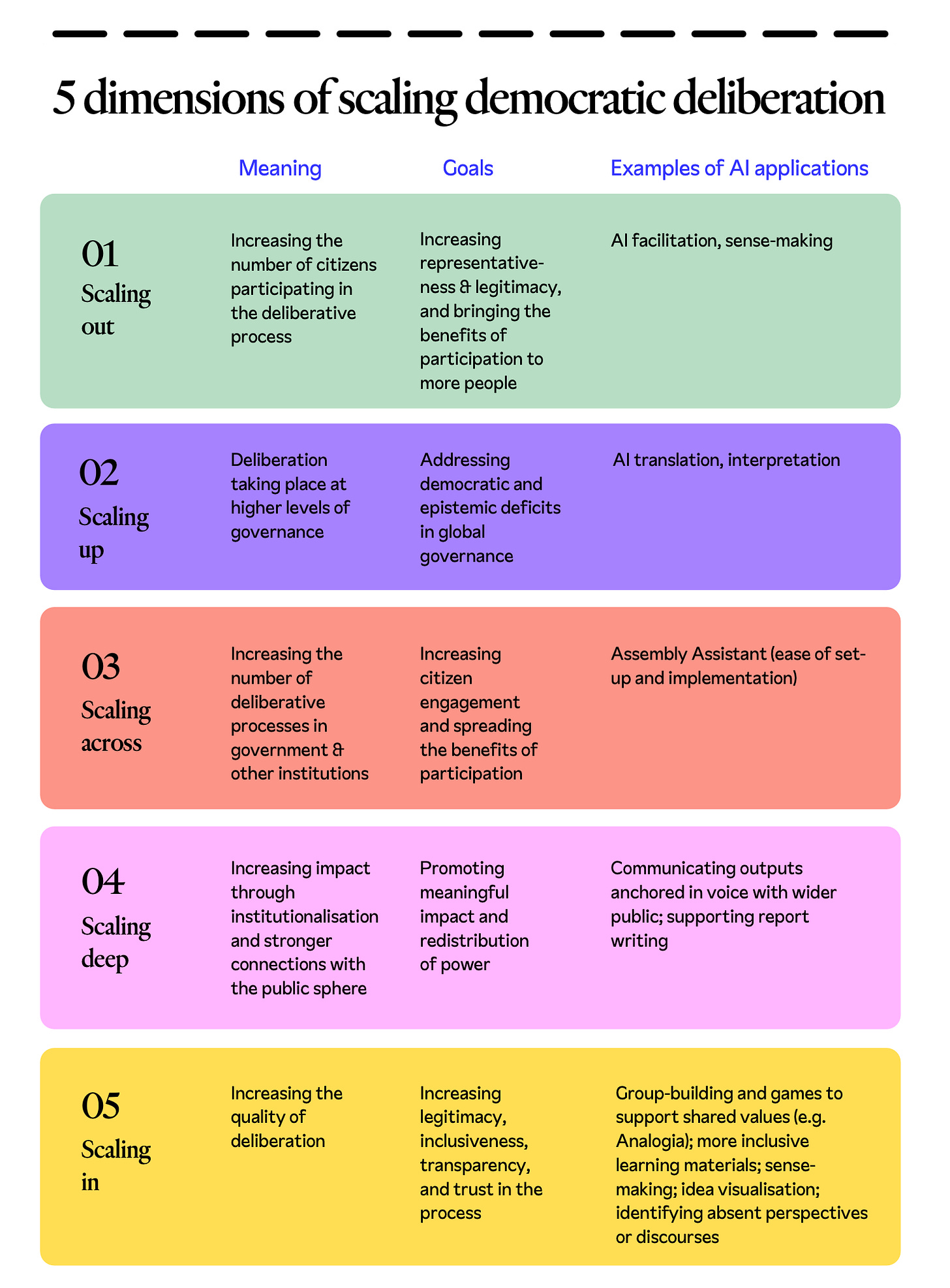 An important next step for their action-orientated research is to rigorously map out and critically analyse AI applications across the full life cycle of deliberative processes whilst keeping this holistic understanding of scale in mind.